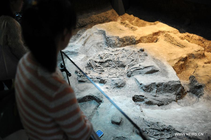 People view "victim remains" at the Memorial Hall of the Victims of the Nanjing Massacre by Japanese Invaders in Nanjing, capital of east China's Jiangsu Province, Sept. 18, 2014, the day marking the 83rd anniversary of the "September 18 Incident". On Sept. 18, 1931, Japanese troops blew up a section of the railway under their control near Shenyang, capital of northeast China's Liaoning Province, and then accused Chinese troops of sabotage as a pretext for attack. They bombarded barracks near Shenyang the same evening, beginning a large-scale armed invasion of northeast China. The incident was followed by Japan's full-scale invasion of China and the rest of Asia, triggering the war against Japanese aggression. (Xinhua/Sun Can)