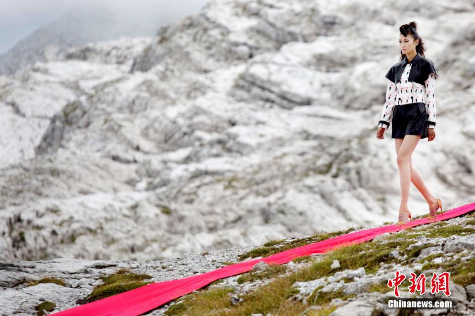 Super models from a Chinese reality show wearing 12cm high heels walk on the 50-meter red carpet on Dolomiti Di Brenta, the Alps in Italy on Sept. 10, 2014. (CNS/GXTV)