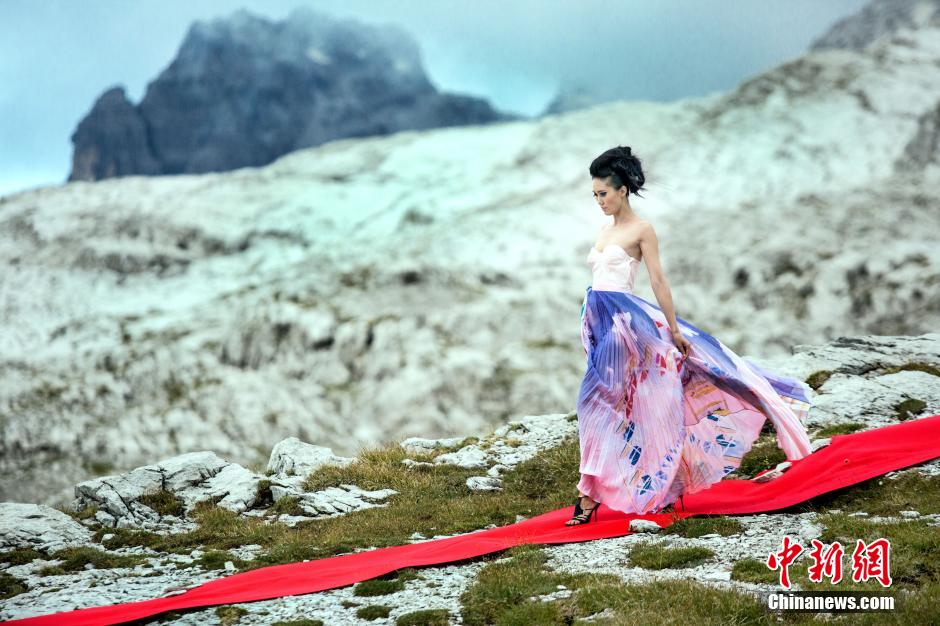 Super models from a Chinese reality show wearing 12cm high heels walk on the 50-meter red carpet on Dolomiti Di Brenta, the Alps in Italy on Sept. 10, 2014. (CNS/GXTV)