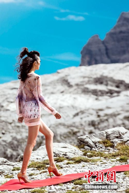 Super models from a Chinese reality show wearing 12cm high heels walk on the 50-meter red carpet on Dolomiti Di Brenta, the Alps in Italy on Sept. 10, 2014. (CNS/GXTV)