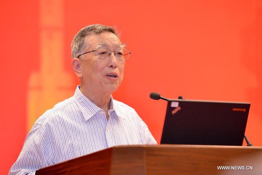 Hu Side, academician of the Chinese Academy of Engineering, makes a report at a seminar commemorating the 50th anniversary of the success in the country's first atomic bomb, in Beijing, China, Sept. 18, 2014. (Xinhua/Li Xin)