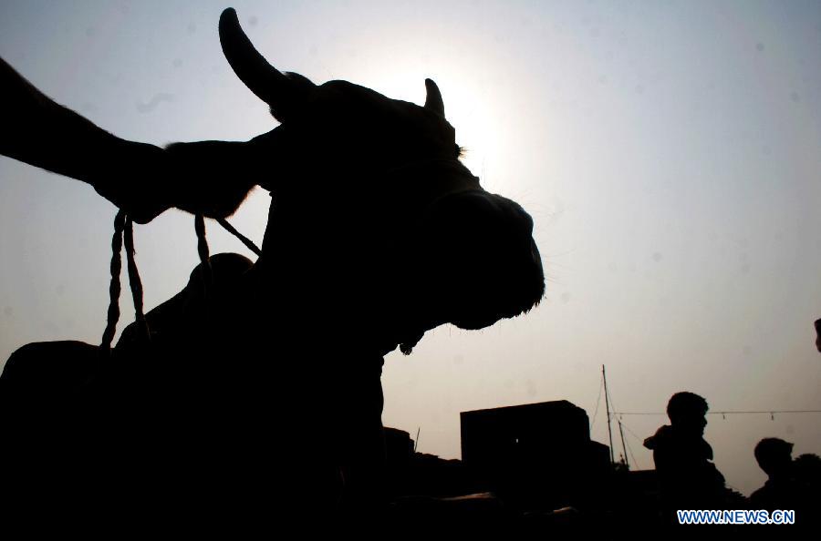 | A vendor waits for customers in a livestock market set for the forthcoming Islamic Feast of Sacrifice Eid al-Adha in northwest Pakistan's Peshawar, Sept. 19, 2014. Eid al-Adha is celebrated to commemorate the willingness of Abraham to sacrifice his son as an act of obedience to God. (Xinhua/Ahmad Sidique) |