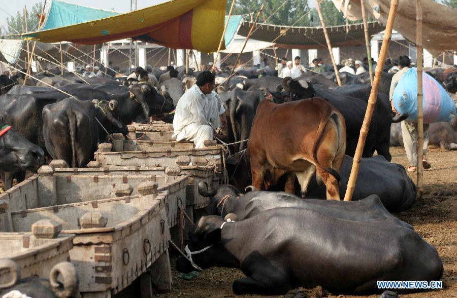Sacrificial animals are seen in a livestock market set for the forthcoming Islamic Feast of Sacrifice Eid al-Adha in northwest Pakistan's Peshawar, Sept. 19, 2014. Eid al-Adha is celebrated to commemorate the willingness of Abraham to sacrifice his son as an act of obedience to God. (Xinhua/Ahmad Sidique)