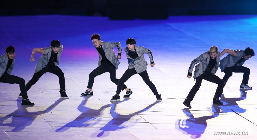 South Korean pop group EXO performs before the opening ceremony of the 17th Asian Games at the Incheon Asiad Main Stadium in Incheon, South Korea, Sept. 19, 2014. (Xinhua/Lin Yiguang)