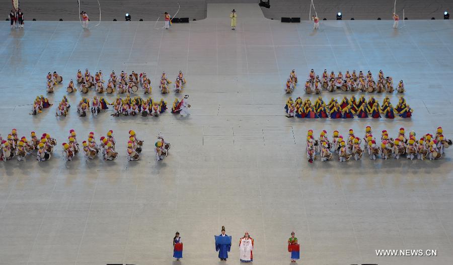 Dancers perform before the opening ceremony of the 17th Asian Games at the Incheon Asiad Main Stadium in Incheon, South Korea, Sept. 19, 2014. (Xinhua/Wang Peng)