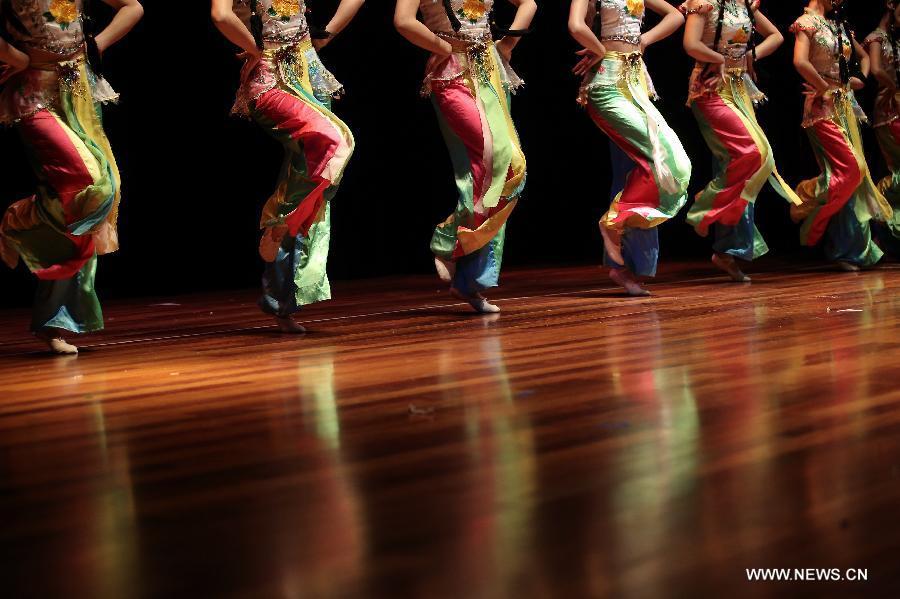 | Members of the Chengdu Artistic Group of China, perform during a presentation in Panama City, capital of Panama, Sept. 18, 2014. The presentation is part of the cultural activities to celebrate the upcoming 65th anniversary of the founding of the People's Republic of China. (Xinhua/Mauricio Valenzuela) |