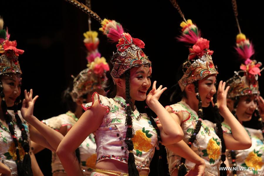 Members of the Chengdu Artistic Group of China, perform during a presentation in Panama City, capital of Panama, Sept. 18, 2014. The presentation is part of the cultural activities to celebrate the upcoming 65th anniversary of the founding of the People's Republic of China. (Xinhua/Mauricio Valenzuela)