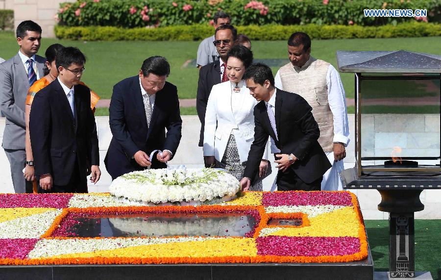 Chinese President Xi Jinping (2nd L front) and his wife Peng Liyuan lay a wreath to the memorial of Mahatma Gandhi in New Delhi, India, Sept. 18, 2014. (Xinhua/Pang Xinglei)