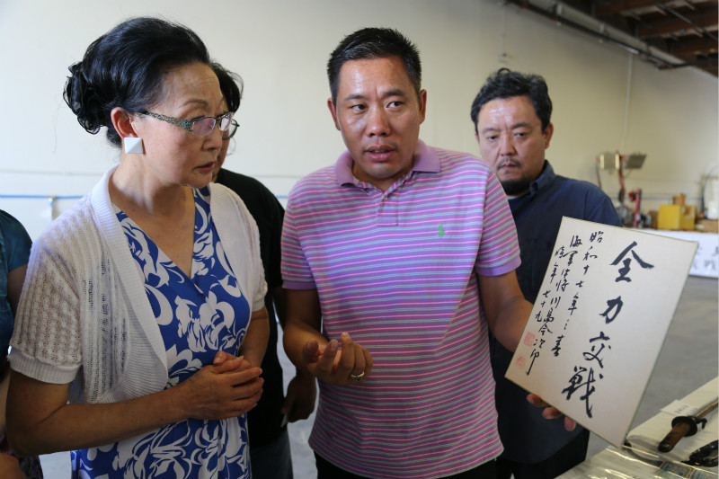 Liu Lei, (R) a Chinese American in San Francisco Bay Area, tells visitors the stories behind the exhibited items. (People's Daily Online/Han Shasha)