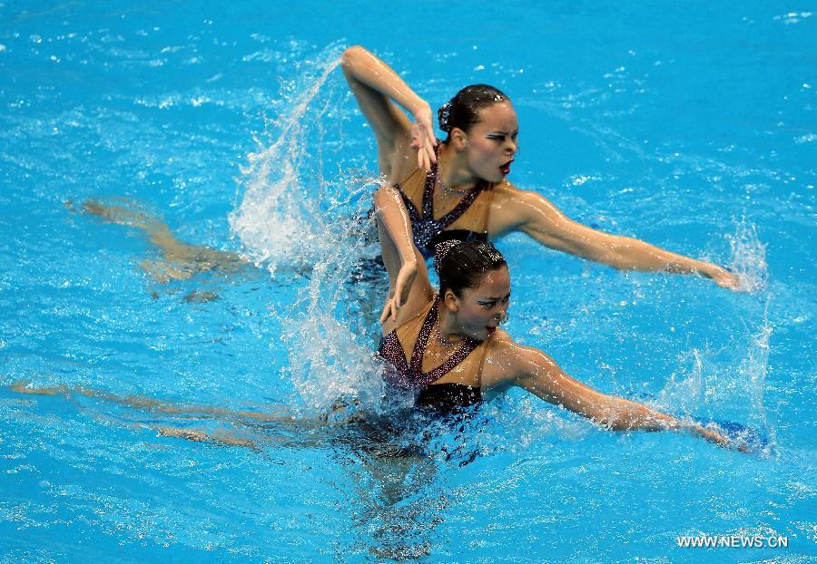 Huang Xuechen (upper) and Sun Wenyan of China perform during the duet technical routine of synchronised swimming competition at the 17th Asian Games in Incheon, South Korea, Sept. 20, 2014. (Xinhua/Meng Yongmin)
