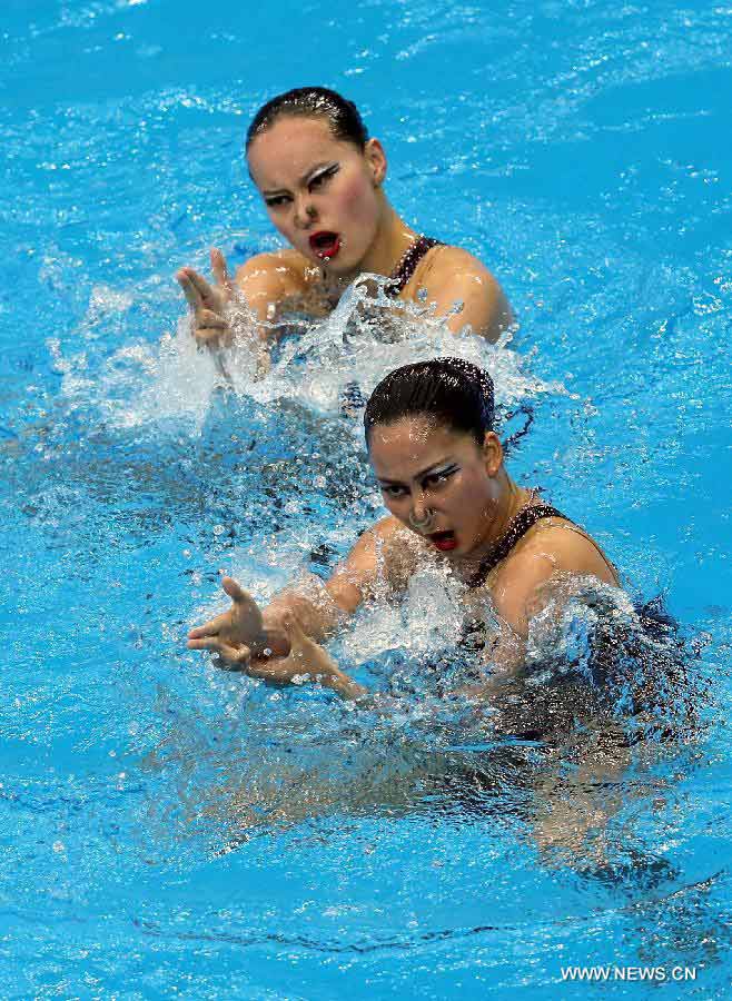 Huang Xuechen (upper) and Sun Wenyan of China perform during the duet technical routine of synchronised swimming competition at the 17th Asian Games in Incheon, South Korea, Sept. 20, 2014. (Xinhua/Meng Yongmin)