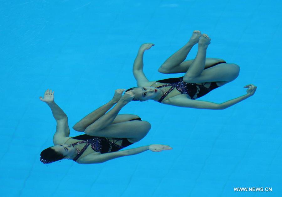 Huang Xuechen (R) and Sun Wenyan of China perform during the duet technical routine of synchronised swimming competition at the 17th Asian Games in Incheon, South Korea, Sept. 20, 2014. (Xinhua/Meng Yongmin)