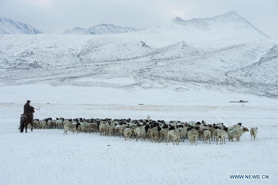 A shepherd herds sheep to find food in Hejing County of Mongolian Autonomous Prefecture of Bayingolin, northwest China's Xinjiang Uygur Autonomous Region, Sept. 20, 2014. A cold front hit here on Saturday, bringing snow and plunging the temperature. (Xinhua/Jiang Wenyao)