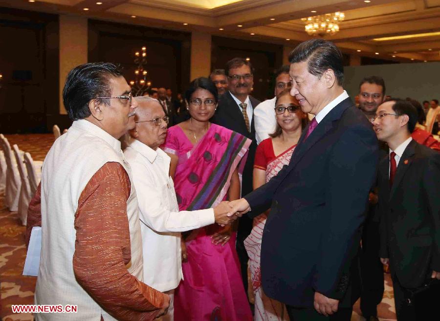 | Chinese President Xi Jinping (R, front) meets with Indian groups and individuals who received friendship awards during the Ceremony for the Five Principles of Peaceful Coexistence Friendship Award in New Delhi, India, Sept. 19, 2014. (Xinhua/Pang Xinglei) |