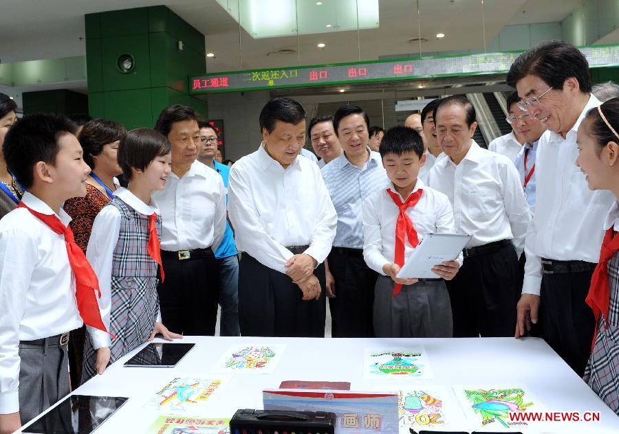 Liu Yunshan (C), a member of the Standing Committee of the Political Bureau of the Communist Party of China (CPC) Central Committee and secretary of the CPC Central Committee's Secretariat, attends an activity marking China's 11th National Science Popularization Day at the China Science and Technology Museum in Beijing, capital of China, Sept. 20, 2014. (Xinhua/Rao Aimin)