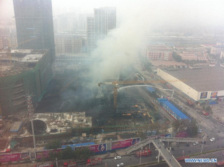 Smoke is seen after a shopping mall under construction caught fire in Tianjin, north China, Sept. 21, 2014. (Xinhua/Yue Yuewei)