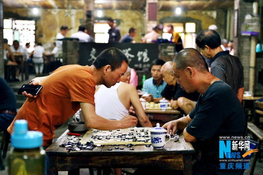 Two tea drinkers pass the time by playing chess at Transportation Teahouse, Aug. 11, 2014. (Xinhua News Agency/Li Xiangbo)