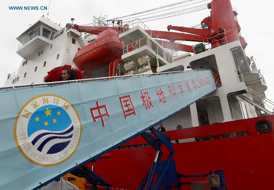 | Staff members carry baggages from icebreaker Xuelong, or "Snow Dragon," to the port in Shanghai, east China, Sept. 23, 2014. Xuelong set out from Shanghai on July 11 and has since traveled some 22,000 km to explore key areas such as the Bering Sea, the Chukchi Sea and the Canada Basin. It traveled as far as 81.11 degrees north latitude and 156.30 degrees east longitude, the team said. (Xinhua/Ding Ting) |