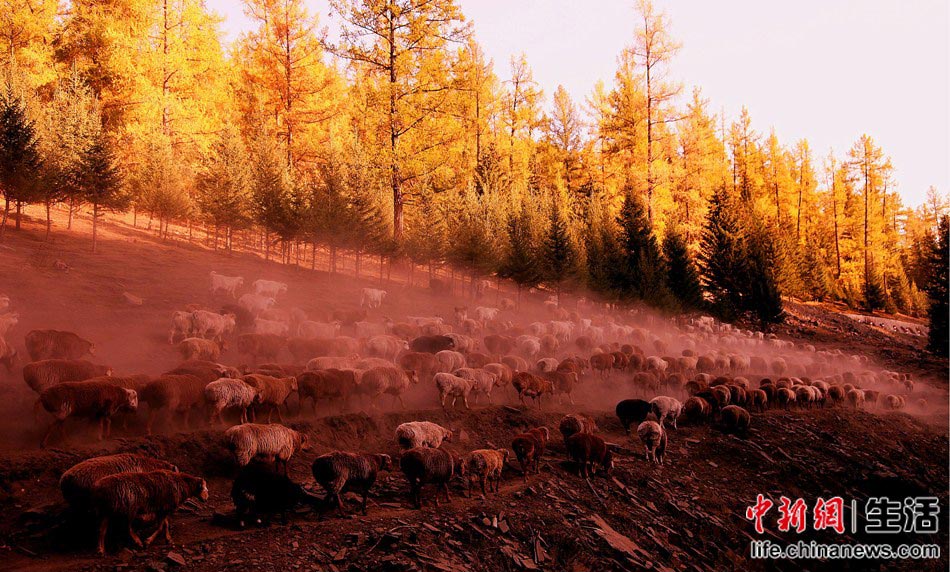 When September comes, Kanas enters a golden season. The plants covered by the golden sunshine, the lake in the near distance, the snow-capped mountains in the backdrop, the small wooden houses and the strolling herds of cattle and sheep, create a fairytale view. [Photo/chinanews.com]