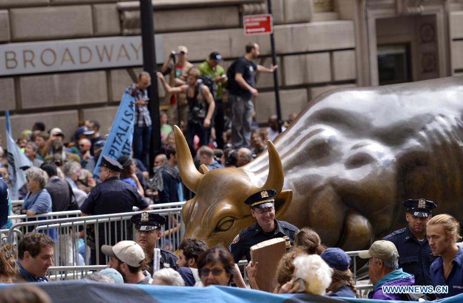 Protestors take part in the "flood Wall Street" demonstrations against climate change in New York, the United States, Spet. 22, 2014. (Xinhua/Yin Bogu)