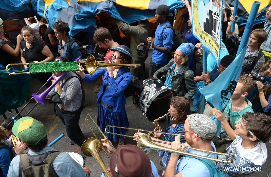 Protestors take part in the "flood Wall Street" demonstrations against climate change in New York, the United States, Spet. 22, 2014. (Xinhua/Yin Bogu)