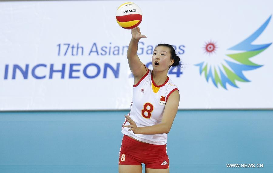 Zhang Changning of China serves during the women's volleyball preliminary round match against China's Hong Kong at the 17th Asian Games in Incheon, South Korea, Sept. 23, 2014. China won 3-0. (Xinhua/Meng Yongmin)