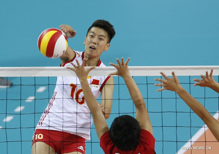 Zhang Xiaoya of China spikes the ball during the women's volleyball preliminary round match against China's Hong Kong at the 17th Asian Games in Incheon, South Korea, Sept. 23, 2014. China won 3-0. (Xinhua/Meng Yongmin)