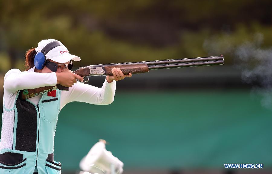 Zhu Jingyu of China competes during the trap women's gold medal match of shooting at the 17th Asian Games in Incheon, South Korea, Sept. 23, 2014. Zhu Jingyu defeated Nakayama Yukie of Japan and claimed the title. (Xinhua/Han Yuqing)