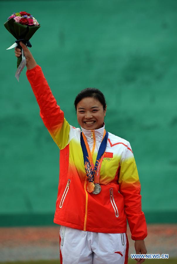 Zhu Jingyu of China competes during the trap women's gold medal match of shooting at the 17th Asian Games in Incheon, South Korea, Sept. 23, 2014. Zhu Jingyu defeated Nakayama Yukie of Japan and claimed the title. (Xinhua/Han Yuqing)