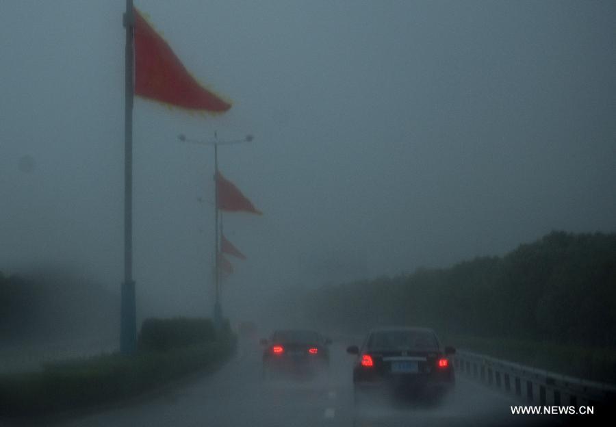 Cars runs in rain storm at Shipu Township of Xiangshan County, east China's Zhejiang Province, Sept. 22, 2014. The 16th typhoon (tropical storm level) this year made the 4th landfall in Hepu Township of Xiangshan County in Zhejiang Province at 7:35 p.m. on Monday. (Xinhua/Han Chuanhao)