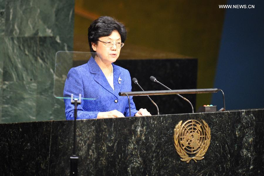 Li Bin, minister in charge of the National Health and Family Planning Commission of China, speaks during a special session of the UN General Assembly on the follow-up to the Program of Action of the International Conference on Population and Development, at the UN headquarters in New York, on Sept. 22, 2014. (Xinhua/Niu Xiaolei)