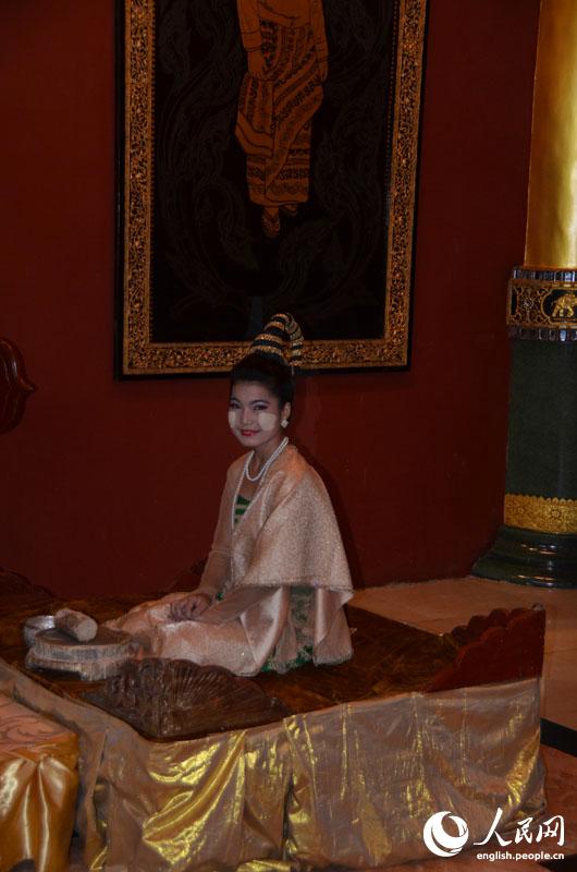 A man welcomes tourists in Karaweik Palace. (People's Daily Online/ Alvaro Lago Sanchez)
