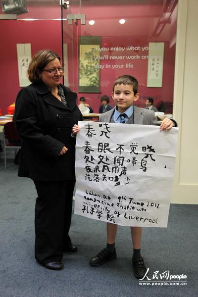 A pupil writes a Chinese poem in Chinese. (People's Daily Online/Li Lizhen)