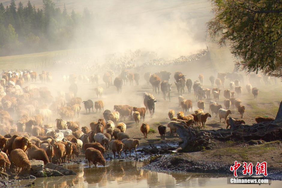 The nomads in Altay prefecture, northwest China's Xinjiang Uygur autonomous region, migrated to winter pasture with hundreds of thousands of cattle and sheep every September.(Chinanews.com/Liu Shihe)