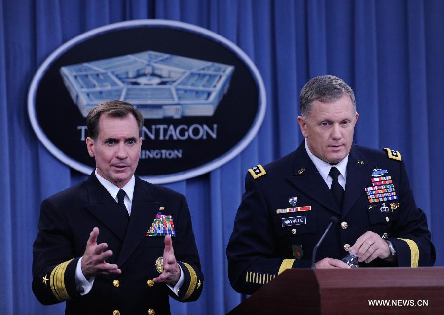 Pentagon Press Secretary John Kirby (L) speaks during a briefing at the Pentagon in Washington D.C., capital of the United States, Sept. 23, 2014. The airstrikes on the Islamic State (IS) targets in Syria overnight Monday were "only the beginning" of a coalition effort of the Unites States and its Arabic allies in the anti-IS fight, a Pentagon spokesman said Tuesday. Meanwhile, U.S. Lieutenant General William Mayville detailed the airstrikes, saying that the initial attack came in three waves. The first was launched from sea by cruise missiles followed by waves of U.S. and Arab bombers and fighters. (Xinhua/Bao Dandan)