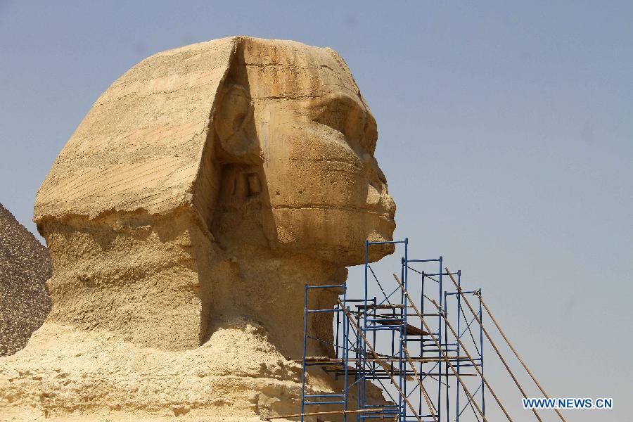 The Great Sphinx undergoes a large restoration process to repair the statue and its worn out base in Cairo, Egypt, on Sept. 21, 2014. (Xinhua/Ahmed Gomaa)