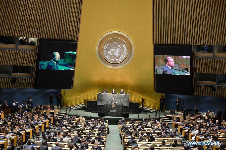 Leonardo DiCaprio, actor and UN Messenger of Peace, speaks during the opening ceremony of the Climate Summit at the UN headquarters in New York, on Sept. 23, 2014. The one-day summit, convened by UN Secretary-General Ban Ki-moon, is expected to galvanize global action on climate change. (Xinhua/Niu Xiaolei)