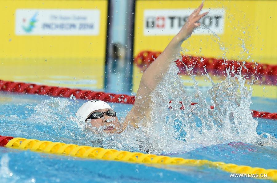 Wang Xueer of China swims during the preliminary match of women's 100m backstroke swimming at the 17th Asian Games in Incheon, South Korea, Sept. 24, 2014. Wang Xueer advanced to the final with 1 minute and 01.39 seconds. (Xinhua/Gong Lei)