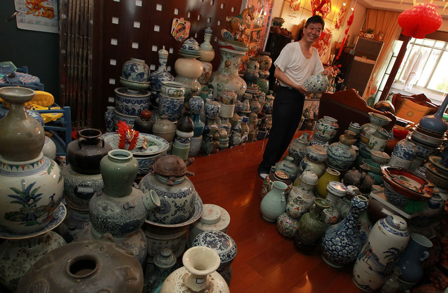 Various types of ceramics in his sitting room. (CNS/Xinhua)