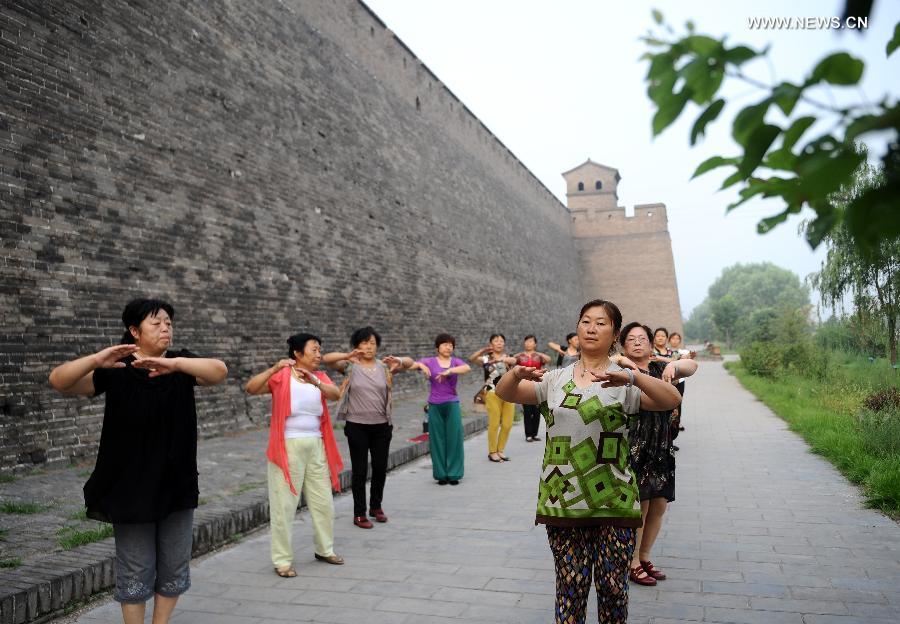 | Residents dance in Pingyao Ancient Town, Pingyao County, north China's Shanxi Province, Aug. 1, 2014. Located in Jinzhong Basin of Shanxi Province, the 2700-year-old Pingyao Ancient Town is one of the most well-preserved ancient towns in China. Pingyao, which was added to the World Heritage List by UNESCO in 1997, attracts numerous tourists from all over the world. (Xinhua/Yan Yan) |