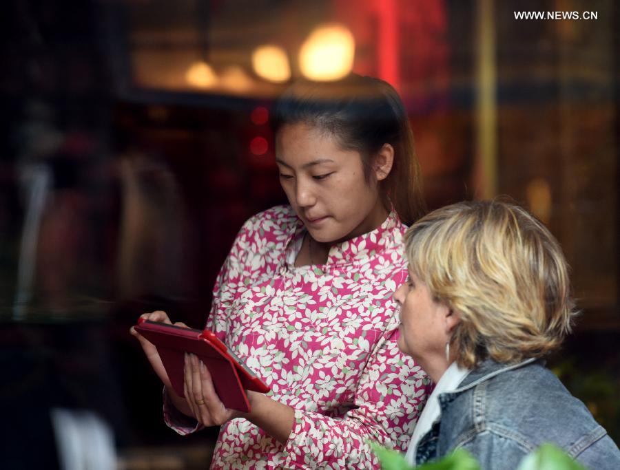 A local inn server chats with a foreign traveller in Pingyao County, north China's Shanxi Province, Sept. 19, 2014. Located in Jinzhong Basin of Shanxi Province, the 2700-year-old Pingyao Ancient Town is one of the most well-preserved ancient towns in China. Pingyao, which was added to the World Heritage List by UNESCO in 1997, attracts numerous tourists from all over the world. (Xinhua/Yan Yan)
