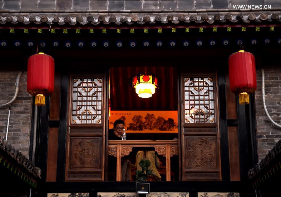 A tourist looks out from a local inn in Pingyao County, north China's Shanxi Province, Sept. 20, 2014. Located in Jinzhong Basin of Shanxi Province, the 2700-year-old Pingyao Ancient Town is one of the most well-preserved ancient towns in China. Pingyao, which was added to the World Heritage List by UNESCO in 1997, attracts numerous tourists from all over the world. (Xinhua/Yan Yan)