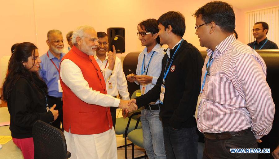 Indian Prime Minister Narendra Modi (3rd L) greets scientists after the Mars Orbiter spacecraft successfully entered the Mars orbit at the Indian Space Research Organisation's Telemetry, Tracking and Command Network in Bangalore, India, Sept. 24, 2014. India Wednesday scripted history by becoming the world's first country to reach Mars in its maiden attempt. (Xinhua/Indian Press Information Bureau)