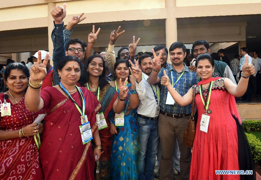 Scientists and officials of Indian Space Research Organisation pose for photos as they celebrate the success of Mars Orbiter Mission (MoM) at their Telemetry, Tracking and Command Network complex in Bangalore, India, Sept. 24, 2014. India Wednesday scripted history by becoming the world's first country to reach Mars in its maiden attempt. (Xinhua/Stringer)