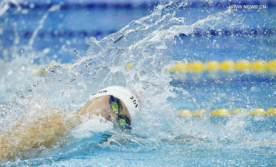 Sun Yang of China swims during the men's 4×100m freestyle relay final of swimming event at the 17th Asian Games in Incheon, South Korea, Sept. 24, 2014. China won the gold medal with 3 minutes and 13.47 seconds. (Xinhua/Wang Peng)