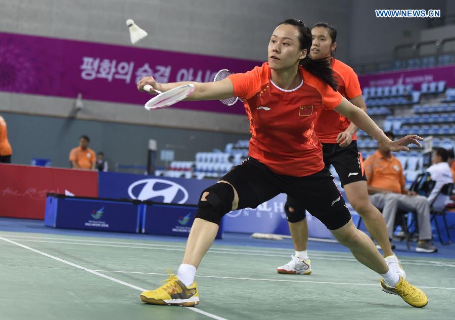 Zhao Yunlei (front) of China returns the shuttlecock during the women's doubles quarterfinal match of badminton against Kim Hana and Jung Kyungeun of South Korea at the 17th Asian Games in Incheon, South Korea, Sept. 25, 2014. Tian Qing and Zhao Yunlei won 2-1. (Xinhua/Ye Pingfan)