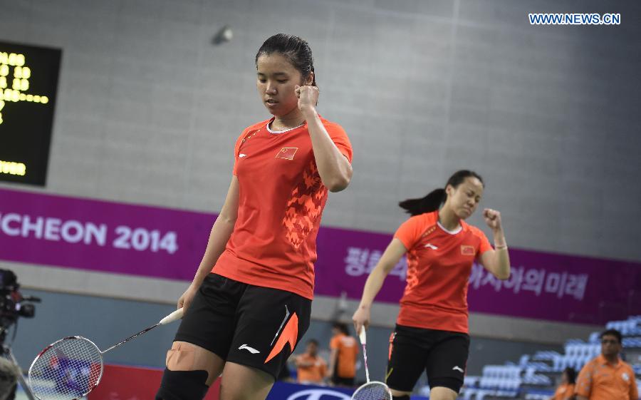 Tian Qing (front) and Zhao Yunlei of China celebrate during the women's doubles quarterfinal match of badminton against Kim Hana and Jung Kyungeun of South Korea at the 17th Asian Games in Incheon, South Korea, Sept. 25, 2014. Tian Qing and Zhao Yunlei won 2-1. (Xinhua/Ye Pingfan)
