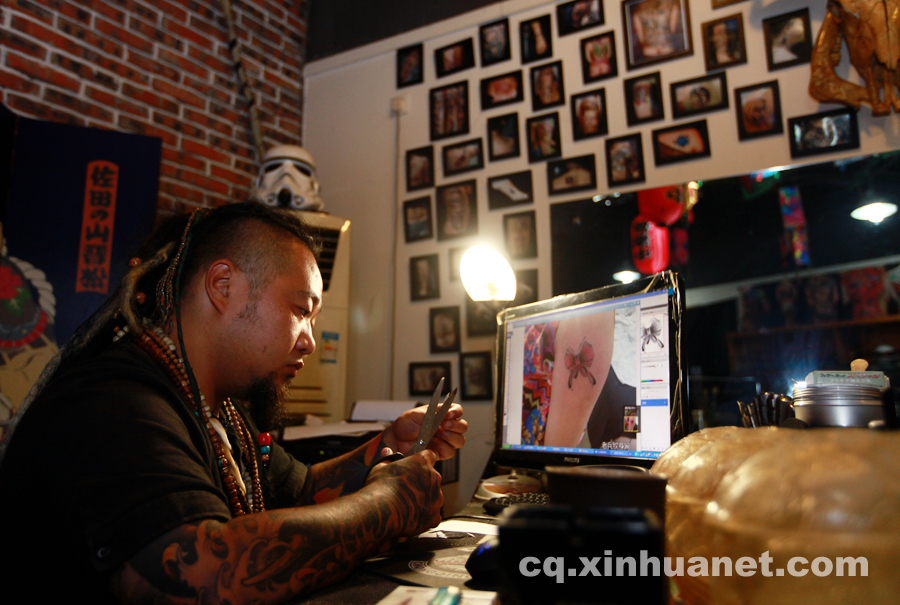 Pan Xi designs tattoo patterns according to costumers' requirements on July 21, 2014. (Xinhua News Agency/Peng Bo)