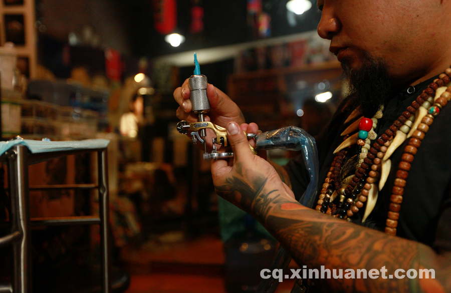 Pan debugs tattooing implements on July 21, 2014. (Xinhua News Agency/Peng Bo)