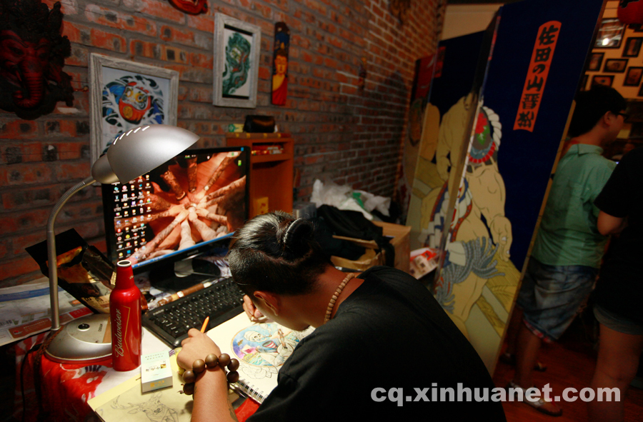 Pan's assistant creates his tattoo works on July 21, 2014. (Xinhua News Agency/Peng Bo)